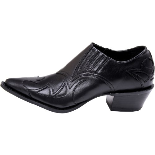 This women's Durango Head West Shoe Boot Cowboy Boot features a black foot with a black wingtip overlay on vamp. Elastic on front sides of the ankle allow for easier on and off. This pointed toe ankle boot features leather uppers and a 1 7/8" heel. Style # RD1411. Black.